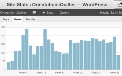 This is very gratifying, to look back and see a nice increase in traffic. Shows up nicely in a weekly view as a trend. On Quiltart, they’re having a “why have a blog?” discussion. Here’s what my first post on Blogger said and I know I’ve revisited this a few times. I was just looking at this page thinking it was a pretty good guide to the decision-making process too.