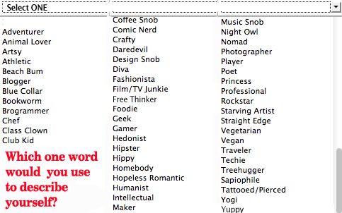 OK, I found this on an online dating service. Along with all the normal stuff: marital status, longest relationship, work, zodiac sign and all, they have added two little extra things and one was a drop down with all these choices.